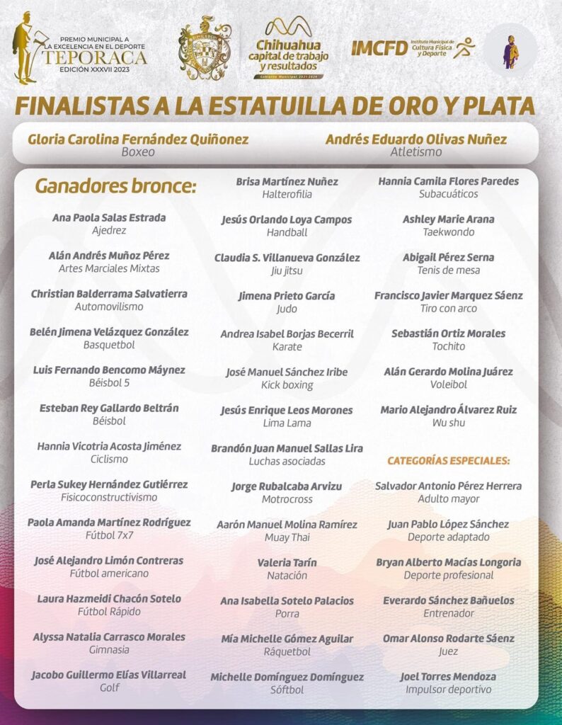 Posteriormente a la evaluación de los candidatos propuestas, brotaron los victoriosos, quienes recibirán el anhelado trofeo de “Teporaca 2023”, los cuales recibirán en la Sesión del Honorable Cabildo del Ayuntamiento de Chihuahua, en su primera reunión del próximo año 2024, la cual se celebrará el veinticinco de enero.