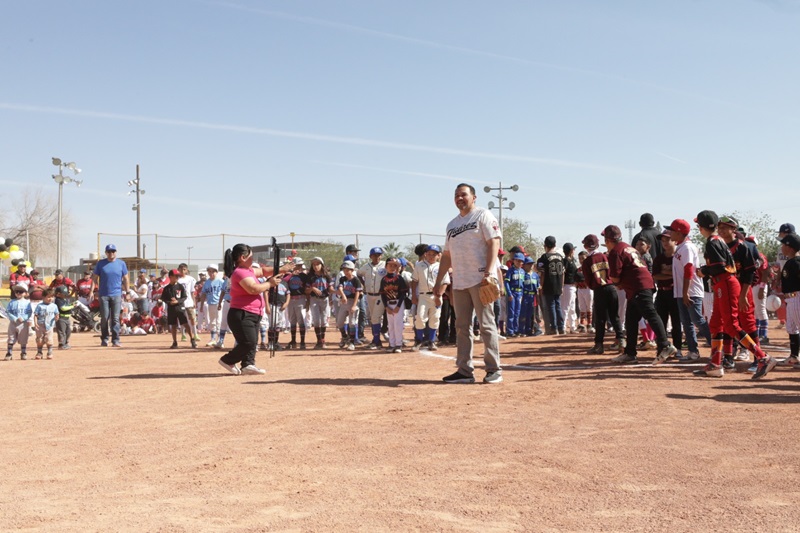 Ciudad Juarez, Chihuahua – El Presidente Municipal, Cruz Pérez Cuéllar, lanzó la primera bola para inaugurar la temporada otoño- invierno de la Liga de Béisbol Infantil y Juvenil Villahermosa, que en esta ocasión lleva el nombre del cronista deportivo Pedro Varela.