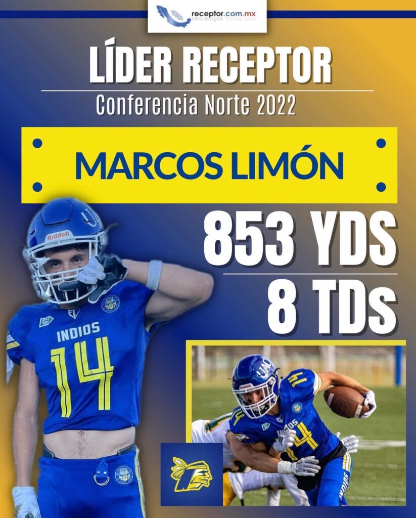 En la temporada 2022, fue seleccionado nacional Marcos Alonzo Limón Contreras, con el número 14 en su jersey, y quien obtuvo la denominación como mejor receptor de los Indios y de la ONEFA, con mayor yardaje y recepciones.