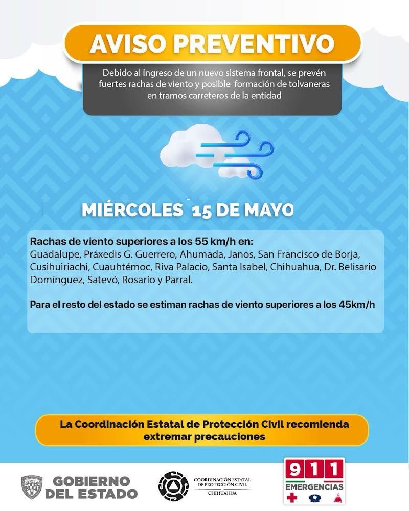 Durante el día miércoles, las rachas alcanzarán velocidades de hasta 55 kilómetros por hora (km/h) en Ascensión, Guadalupe, Práxedis G. Guerrero, Ahumada, Janos, San Francisco de Borja, Cusihuiriachi, Cuauhtémoc, Juárez, Riva Palacio, Santa Isabel, Chihuahua, Dr. Belisario Domínguez, Satevó, Rosario y Parral.