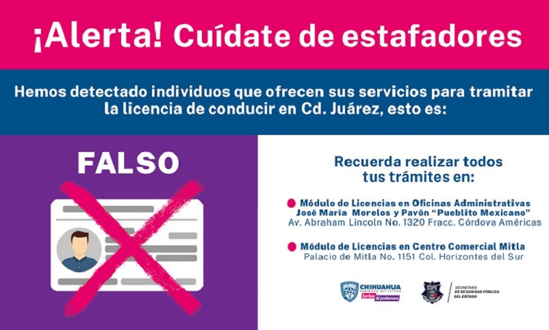 Chihuahua, Chihuahua – La oficina de Licencias Digitales en Ciudad Juárez, dependiente de la Secretaría de Seguridad Pública Estatal, alerta a la ciudadanía para evitar caer en fraudes por anuncios que aparecen en redes sociales en donde se ofrece la licencia de conducir.