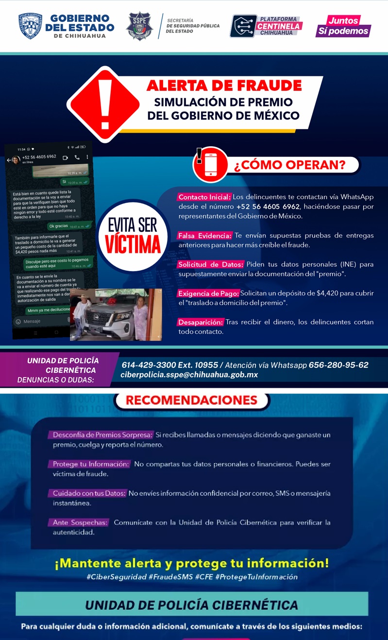 En caso de sospechar de algún sitio o número, comunícate con la Unidad de Policía Cibernética para revisar la veracidad, a través de los números 614-429-3300 ext. 10955, 614-429-7315, vía WhatsApp 656-280-9562, o al correo electrónico: ciberpolicia.sspe@chihuahua.gob.mx