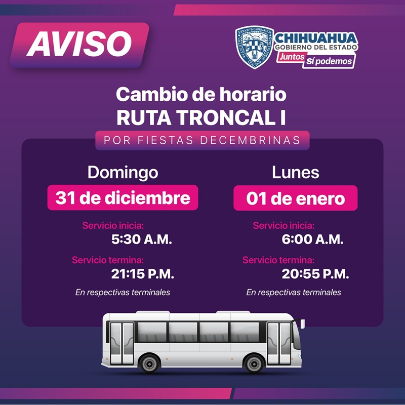 Chihuahua, Chihuahua – La OTV informa que durante los días 31 de diciembre y 1 de enero de 2024, habrá modificaciones en los horarios de las primeras y últimas salidas de autobuses, con motivo de los festejos de año nuevo.