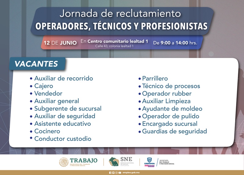 Chihuahua, Chihuahua – La Secretaría del Trabajo y Previsión Social (STPS), a través del Servicio Estatal de Empleo (SEE), llevará la Jornada de Reclutamiento al Centro Comunitario de la colonia Lealtad 1, este miércoles 12 de junio de 9:00 a 14:00 horas.