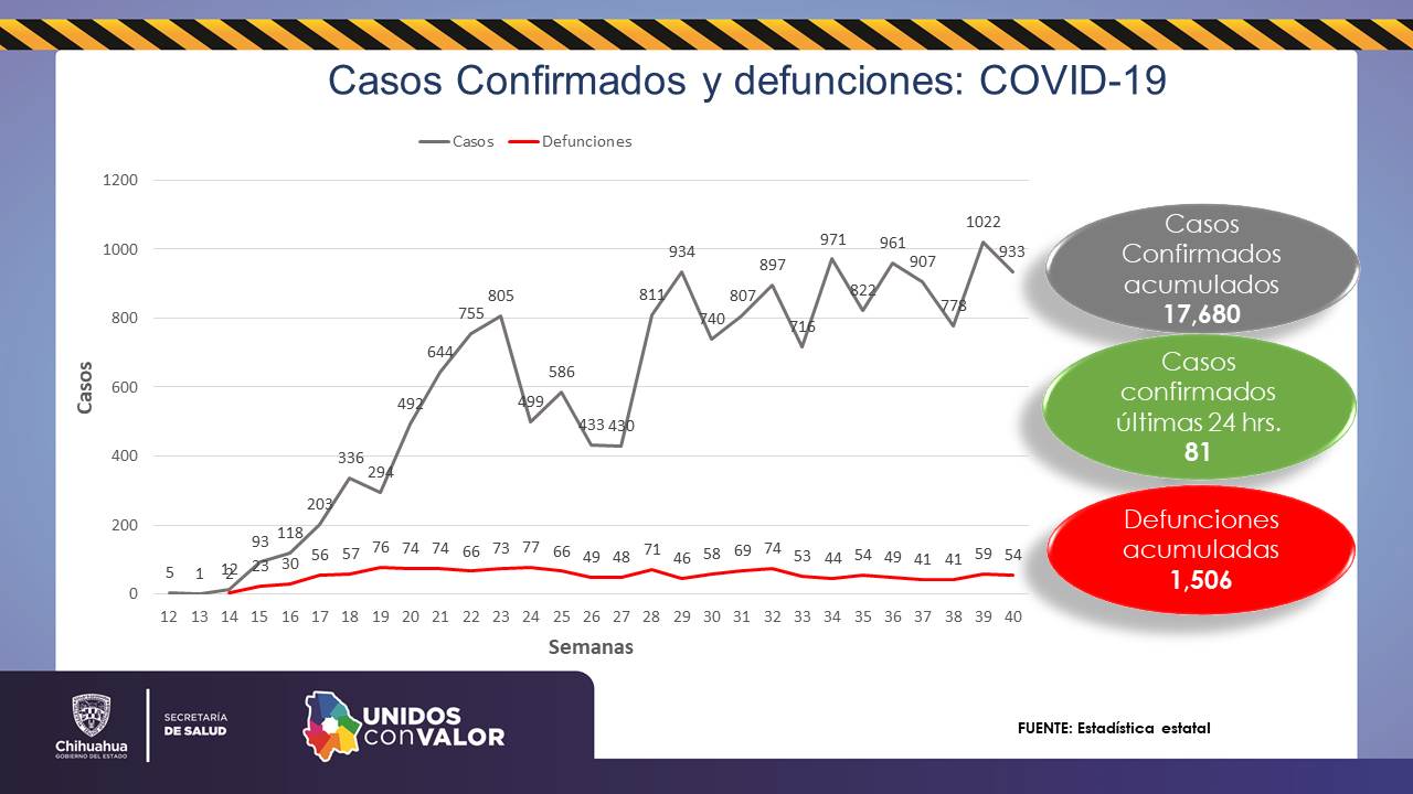 Chihuahua, Chihuahua – La Secretaría de Salud informó que el estado de Chihuahua inició la semana con un total general de 17 mil 680 casos confirmados de COVID-19, con 81 nuevos registros, así como mil 506 personas fallecidas con 2 más ocurridas en la capital del estado.