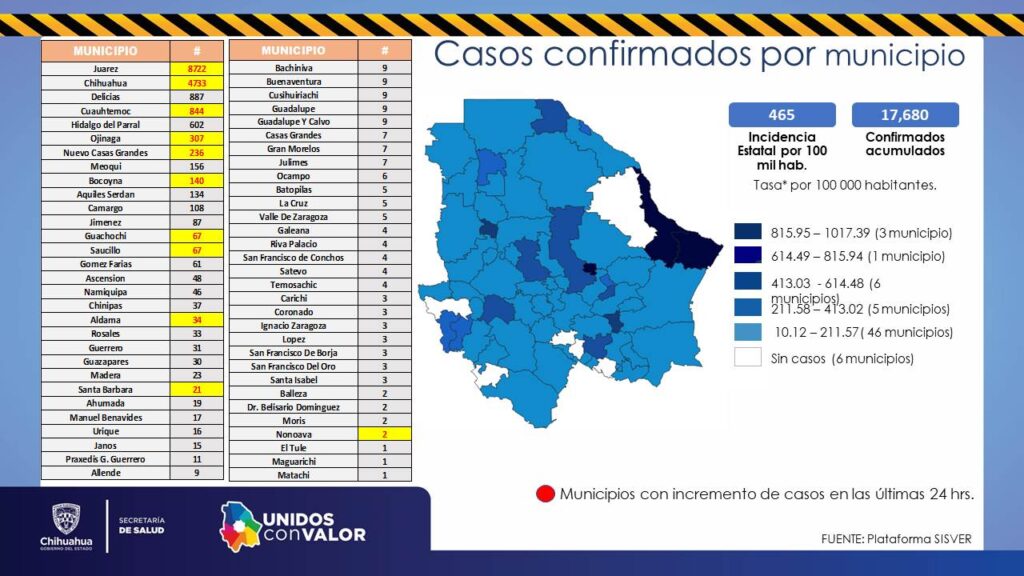 Casos activos por municipio (al 11 de octubre) Juárez 405 casos, Chihuahua 172, Parral 36, Delicias 21, Cuauhtémoc 17, Ojinaga 13, Nuevo Casas Grandes 11, Camargo 7, Saucillo 7 y Santa Bárbara 5; Jiménez, Valle de Zaragoza, Rosales y Guachochi con 2 y Ahumada, Aquiles Serdán, San Francisco de Conchos, Cusihuiriachi, Madera, Guadalupe, Meoqui, Aldama, Bocoyna y Nonoava con 1 caso cada uno.