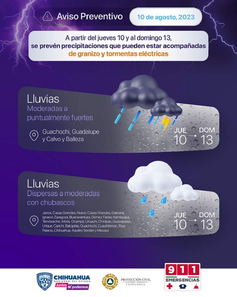 También se pronostican lluvias de moderadas a fuertes en Casas Grandes, Madera, Temósachic, Guadalupe y Calvo, y Balleza. Estas precipitaciones pueden estar acompañadas de actividad eléctrica, viento y caída de granizo.