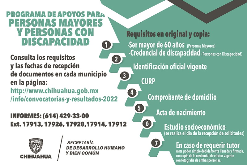 Chihuahua, Chihuahua – El Gobierno del Estado, a través de la Secretaría de Desarrollo Humano y Bien Común, dio a conocer las convocatorias del Programa de Apoyos para Personas Mayores y Personas con Discapacidad 2022, por lo que el registro para dicho benefició comenzará en breve en todos los municipios.