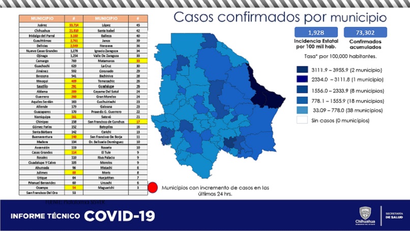 Chihuahua, Chihuahua – Desde el inicio de la pandemia por el coronavirus SARS-CoV-2 en el estado de Chihuahua van 73 mil 302 contagios acumulados y 7 mil 708 defunciones, de acuerdo al último reporte epidemiológico de la Secretaría de Salud estatal.