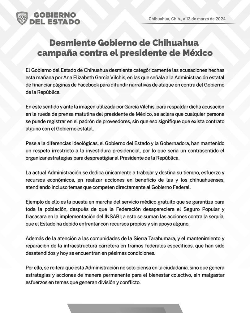 Chihuahua, Chihuahua – El Gobierno del Estado de Chihuahua desmiente categóricamente las acusaciones hechas esta mañana por Ana Elizabeth García Vilchis, en las que señala a la Administración estatal de financiar páginas de Facebook para difundir narrativas de ataque en contra del Gobierno de la República.
