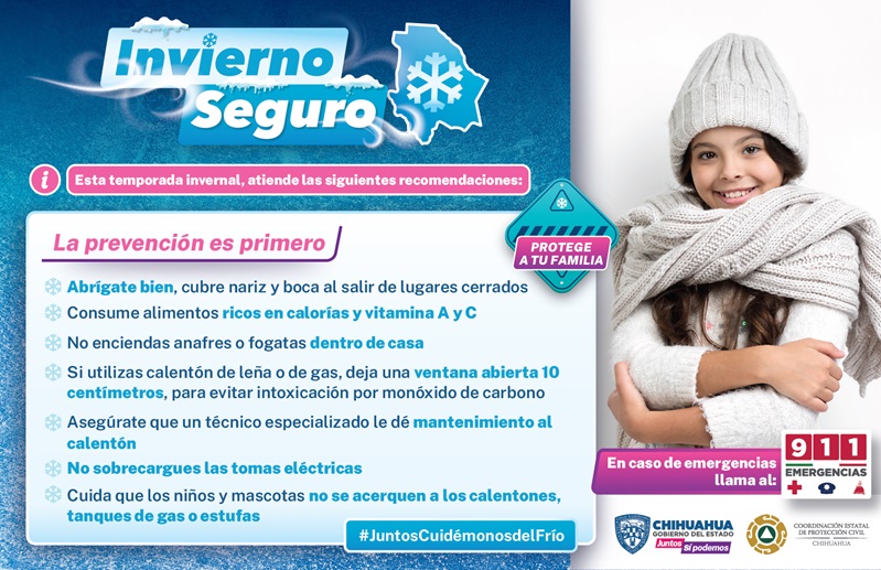 Chihuahua – Con la llegada a la entidad del frente frío número 8 acompañado de una masa de aire ártico, que se espera desde la madrugada del lunes 30 al miércoles 1 de noviembre, la Coordinación Estatal de Protección Civil (CEPC) emite una serie de recomendaciones esenciales para reducir los riesgos asociados a las bajas temperaturas pronosticadas.