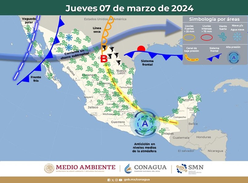 Para el jueves 7 de marzo, el pronóstico indica que, el frente frío número 39 y una vaguada polar sobre el noroeste del país, en interacción con la corriente en chorro y un canal de baja presión, provocarán vientos de moderados a fuertes.