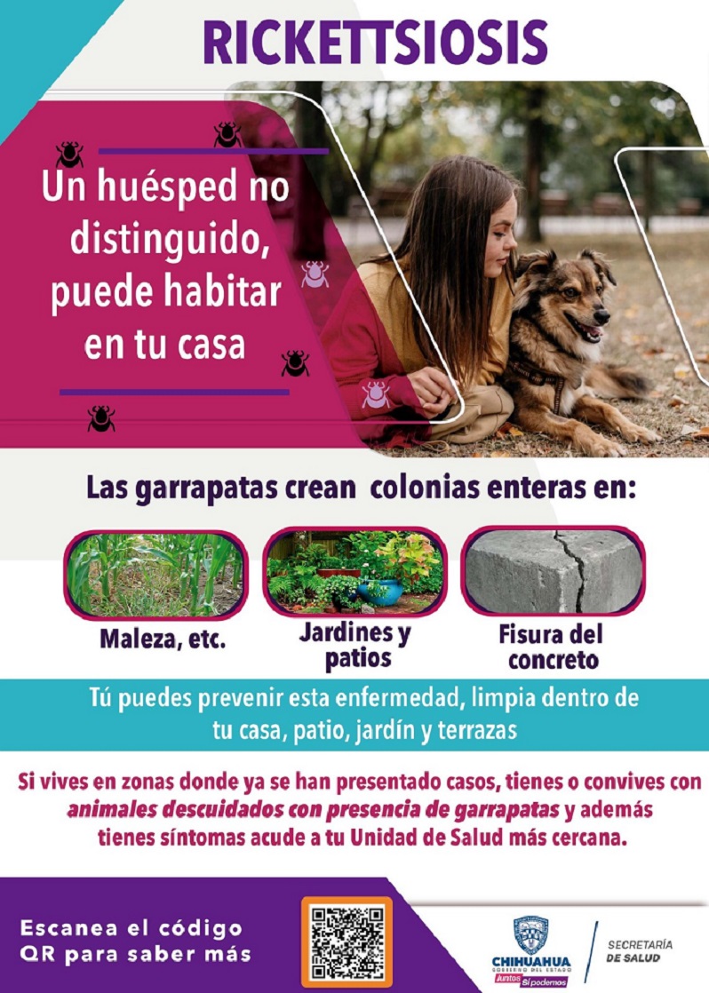 Ciudad Juárez, Chihuahua – La Secretaría de Salud exhorta a la población a llevar a cabo acciones de prevención ante la rickettsiosis, como limpieza del hogar, patios y jardines, así como cuidados pertinentes en mascotas e higiene personal en los integrantes de la familia.