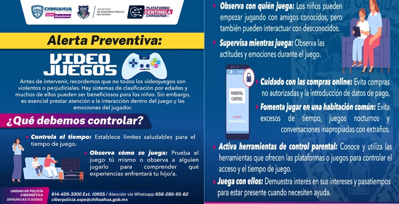 Chihuahua, Chihuahua – La Unidad de Policía Cibernética de la Secretaría de Seguridad Pública del Estado (SSPE), emitió una serie de recomendaciones para prevenir el riesgo por el que pueden pasar los más jóvenes a la hora de utilizar videojuegos, y evitar cualquier exposición al peligro.