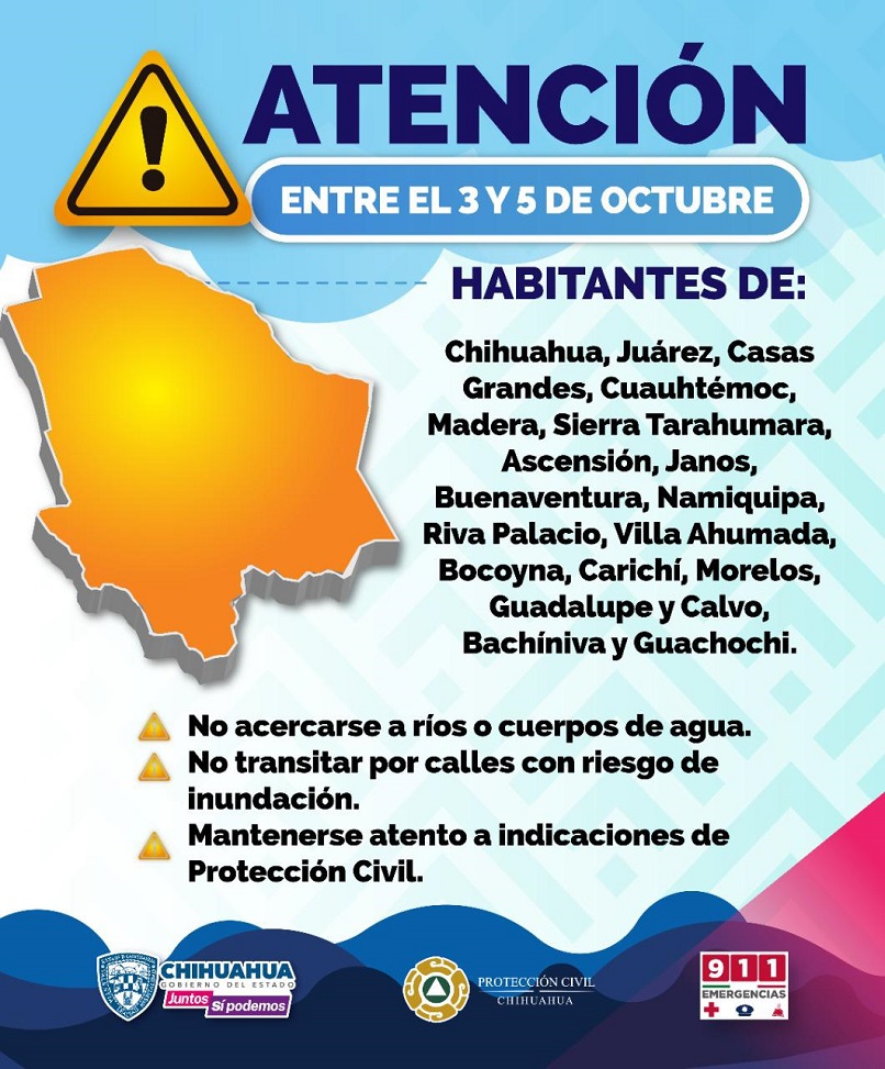 Para el martes 4, se prevén acumulados superiores a 10 milímetros en la mayor parte de la región serrana, además de Ascensión, Janos, Buenaventura, Namiquipa Riva Palacio, Cuauhtémoc, Ahumada y Juárez.