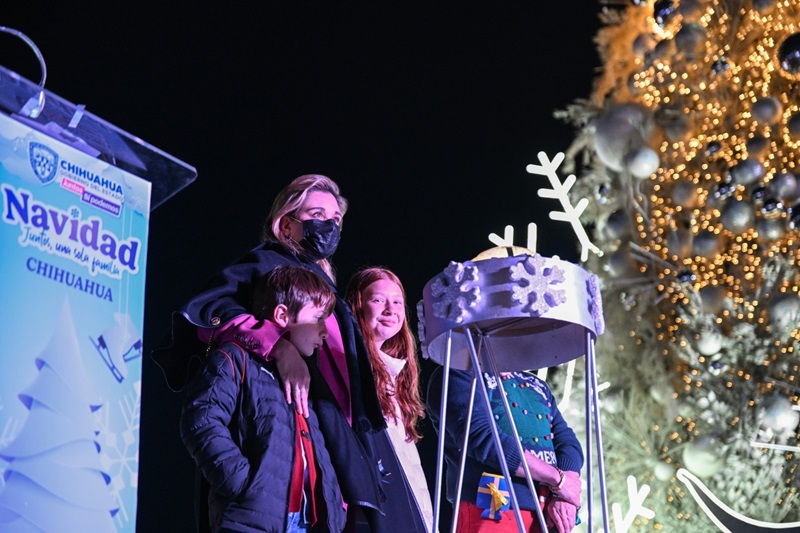 Chihuahua, Chihuahua – Al encabezar la ceremonia del tradicional encendido del Árbol de Navidad en la Plaza del Ángel, la gobernadora Maru Campos dijo a los chihuahuenses: “Encendamos una luz en nuestros corazones con las victorias que conquistamos este año”.