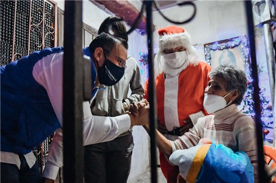 Al norte de la ciudad, llegaron a un domicilio de la colonia Granjas, donde afuera de su domicilio estaba sentada María Eduviges, quien soltó en llanto al ver llegar al alcalde Marco Bonilla, cargando el pavo, una despensa, acompañado de Santa con juguetes para sus niños.