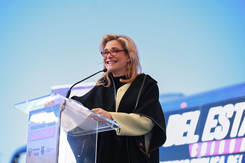 Durante una ceremonia que se desarrolló en las inmediaciones de la Puerta de Chihuahua, la mandataria estatal distribuyó además 1,368 chamarras, que formarán parte del uniforme de elementos de 50 corporaciones municipales de seguridad pública.