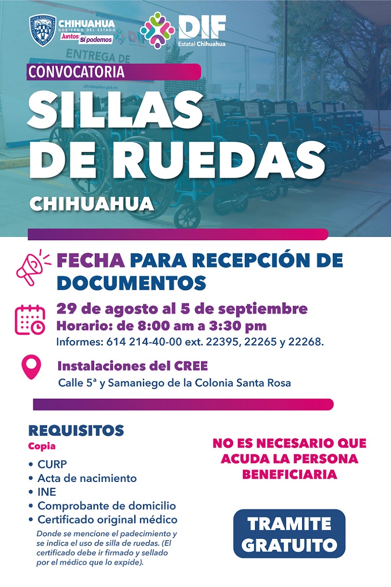 Las y los interesados en ser beneficiados deberán presentar copia de la Clave Única de Registro de Población (CURP), acta de nacimiento, credencial del Instituto Nacional Electoral (INE), comprobante de domicilio y el certificado médico original que indique que la persona solicitante requiere silla de ruedas.