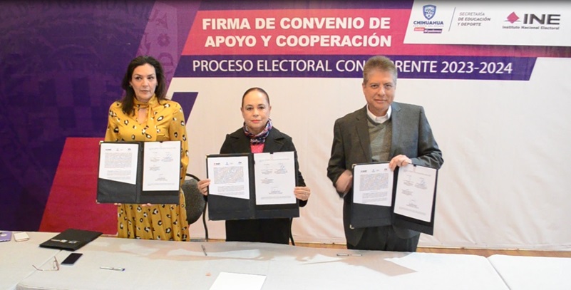 Chihuahua, Chihuahua – La Secretaría de Educación y Deporte (SEyD) firmó un convenio de colaboración con el Instituto Nacional Electoral (INE) y el Instituto Estatal Electoral de Chihuahua (IEE), para la utilización de 2 mil 120 planteles educativos en el Proceso Electoral Concurrente 2023-2024.