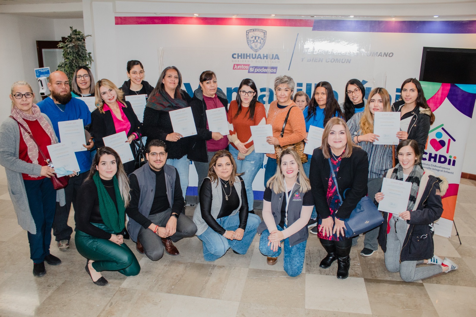 Chihuahua, Chihuahua.- El Gobierno del Estado de Chihuahua a través de la Secretaría de Desarrollo Humano y Bien Común, realizó la entrega de constancias a personal de veintitrés centros de atención infantil de la ciudad de Chihuahua, que concluyeron la capacitación para la alineación en el estándar con fines de certificación.