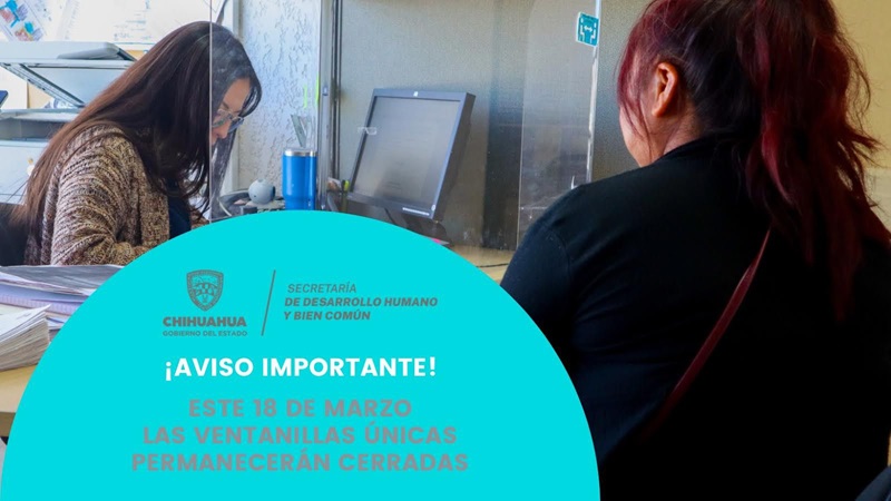 Chihuahua, Chihuahua – La Secretaría de Desarrollo Humano y Bien Común (SDHyBC) anunció que, con motivo de la conmemoración del natalicio de Benito Juárez, hoy lunes 18 de marzo permanecerán cerradas las Ventanillas Únicas en los municipios de Chihuahua, Nuevo Casas Grandes e Hidalgo del Parral.
