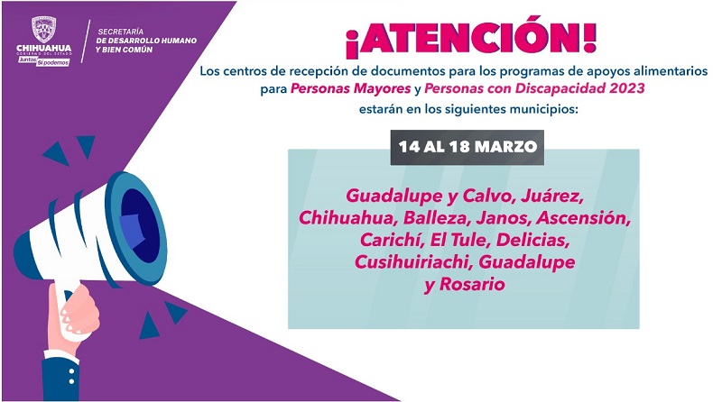 Chihuahua, Chihuahua – Gobierno del Estado, a través de la Secretaría de Desarrollo Humano y Bien Común (SDHyBC), informó que comenzará la recepción de documentos de las convocatorias para apoyos alimentarios a personas mayores o con alguna discapacidad.
