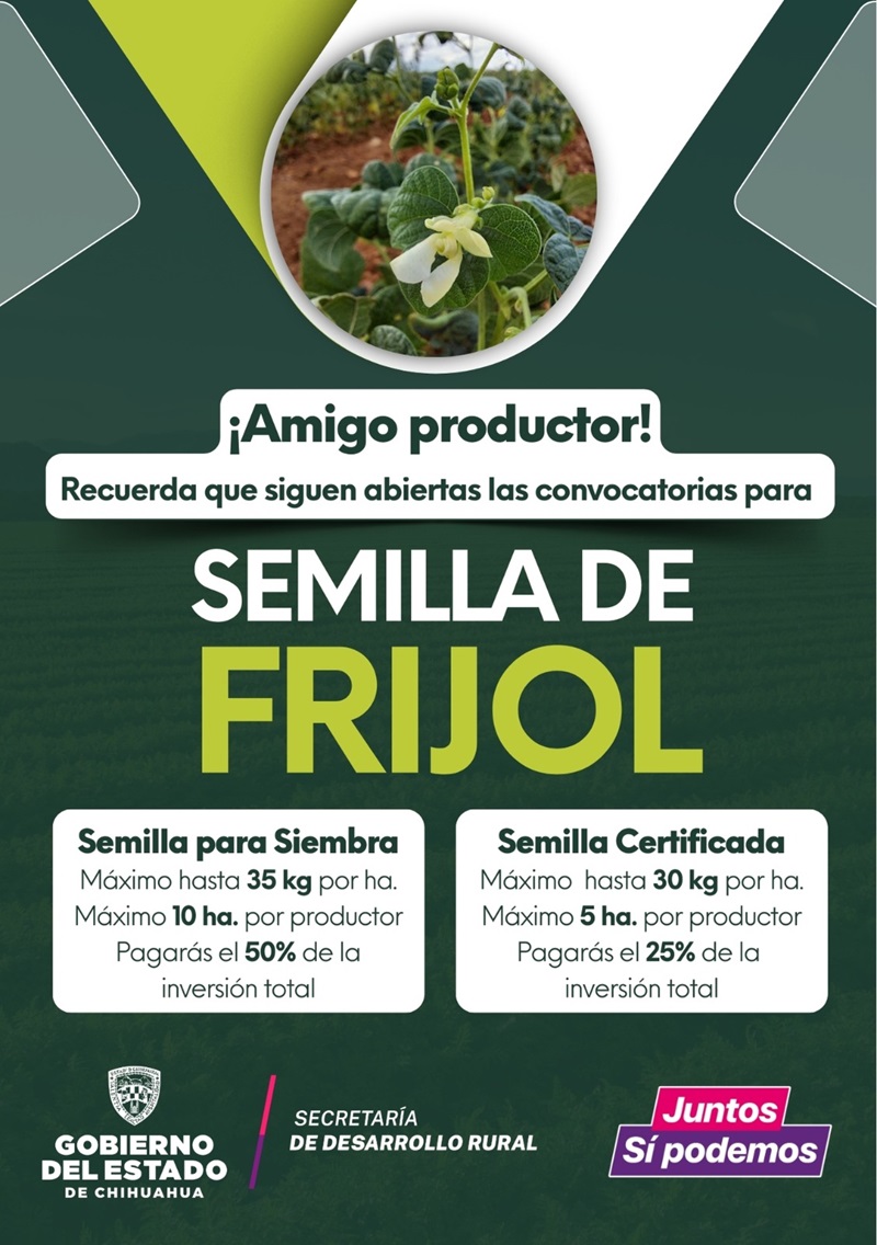 Chihuahua, Chihuahua – La Secretaría de Desarrollo Rural (SDR) informó que ha destinado 6 millones de pesos (mdp), en subsidios para la adquisición de semilla de frijol certificada y apta para siembra, por lo que invita a los productores locales a aprovechar los esquemas de apoyo que se encuentran vigentes.