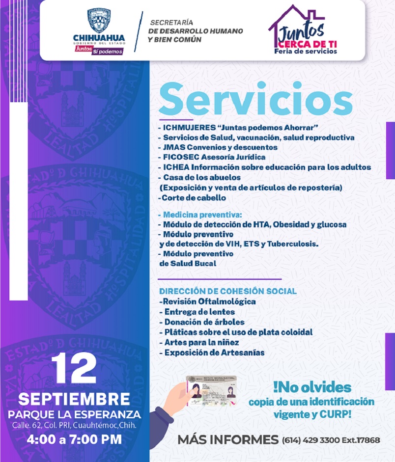Chihuahua, Chihuahua – Con el propósito de acercar los servicios que brinda el Gobierno del Estado a la ciudadanía, la Secretaría de Desarrollo Humano y Bien Común (SDHyBC) invita a aprovechar la feria de servicios “Juntos Cerca de Ti”, que se llevará a cabo el próximo martes 12 de septiembre en ciudad Cuauhtémoc.