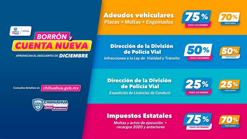 Chihuahua, Chihuahua – El Gobierno del Estado, recuerda a la ciudadanía que continúa vigente el programa “Borrón y Cuenta Nueva” con el cual pueden obtener descuentos de hasta el 75% durante el mes de diciembre y enero en adeudos vehiculares, expedición de licencias de conducir, impuestos estatales e infracciones de tránsito.
