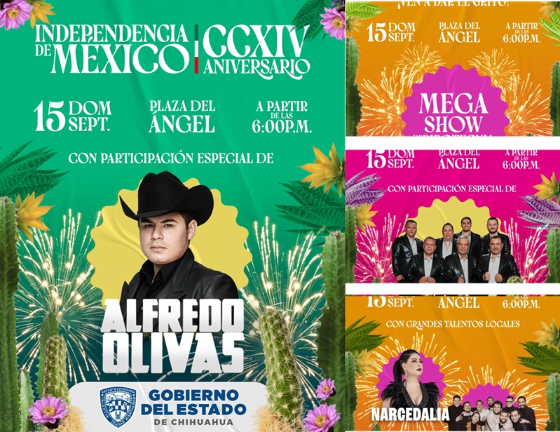 Chihuahua, Chihuahua – En el marco de la celebración del 214 aniversario del Grito de Independencia, el Gobierno del Estado invita a las y los chihuahuenses a participar en la gran fiesta que se llevará a cabo en la Plaza del Ángel a cargo de artistas locales y nacionales, junto con un mega show de pirotecnia.