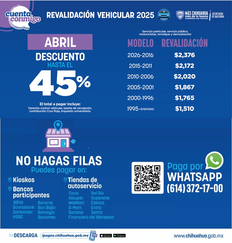 La Secretaría de Hacienda recuerda a las y los contribuyentes que pueden realizar su pago a través de la página: ipagos.chihuahua.gob.mx, en donde pueden descargar su referencia para pagar en bancos y tiendas de autoservicio.