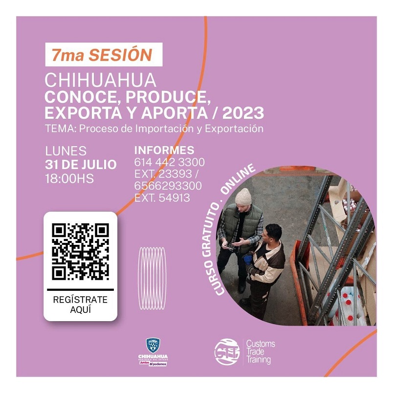 Junto a Customs Trade Training, se invita a empresas con interés de exportar sus productos a la séptima edición de “Chihuahua conoce, produce, exporta y aporta 2023” con el tema Proceso de Importación y Exportación, el próximo 31 de julio a las 18:00 horas. El registro se realiza en: https://docs.google.com/forms/d/e/1FAIpQLSdYoTABERxfpz1msgOH8_rPT6gH40YTTo921YSmNUXrJP5DQ/viewform