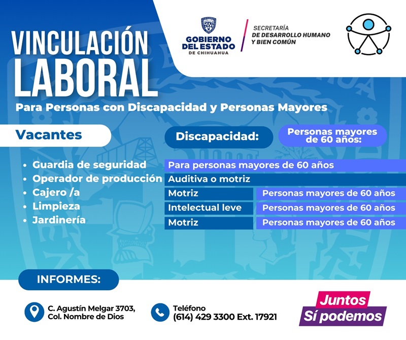 Chihuahua, Chihuahua – Con el objetivo de fomentar la inserción laboral con el apoyo de empresas inclusivas, la Secretaría de Desarrollo Humano y Bien Común (SDHyBC), dio a conocer las vacantes de trabajo dirigidas a personas mayores o con alguna discapacidad.