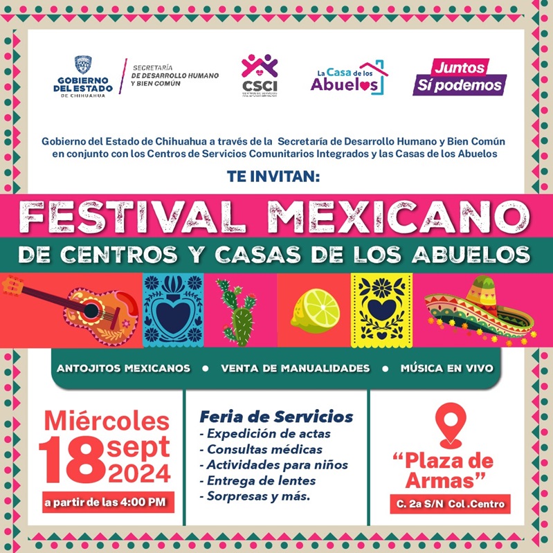 Chihuahua, Chihuahua – La Secretaría de Desarrollo Humano y Bien Común (SDHyBC), invita a las y los chihuahuenses a disfrutar en familia del “Festival mexicano de Centros Comunitarios y Casas de los Abuelos”, este miércoles 18 de septiembre en la Plaza de Armas.