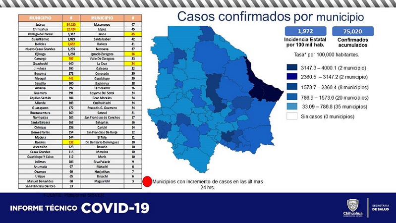 Los contagios confirmados por municipio son: 34,120 Juárez, 22,424 Chihuahua, 3,312 Hidalgo del Parral, 2,8289 Cuauhtémoc, 2,652 Delicias, 1,285 Nuevo Casas Grandes, 1,268 Ojinaga, 787 Camargo, 640 Guachochi, 599 Jiménez, 572 Bocoyna, 441 Meoqui, 300 Saucillo, 292 Aldama, 291 Guerrero, 184 Aquiles Serdán, 183 Allende, 172 Guazapares, 169 Buenaventura, 166 Namiquipa, 162 Santa Bárbara, 158 Chínipas, 154 Gómez Farías, 144 Madera, 132 Rosales, 123 Ascensión, 115 Casas Grandes, 112 Guadalupe y Calvo, 104 Julimes, 97 Ahumada, 90 Ocampo, 65 Urique, 60 Manuel Benavides, 53 San Francisco del Oro, 45 López, 45 Janos, 45 Matamoros, 42 Santa Isabel, 41 Balleza, 37 Nonoava, 36 Ignacio Zaragoza, 34 La Cruz, 33 Valle de Zaragoza, 32 Galeana, 30 Coronado, 29 Guadalupe, 28 Bachíniva, 26 Temósachic, 24 Gran Morelos, 24 Coyame del Sotol, 24 Cusihuiriachi, 24 Praxedis G. Guerrero, 21 Satevó, 17 San Francisco de Conchos, 16 Batopilas, 14 Carichí, 12 San Francisco de Borja, 11 El Tule, 10 Dr. Belisario Domínguez, 10 Rosario, 10 Morelos, 10 Moris, 9 Riva Palacio, 8 Matachí, 7 Huejotitán, 6 Uruachi y 3 Maguarichi.