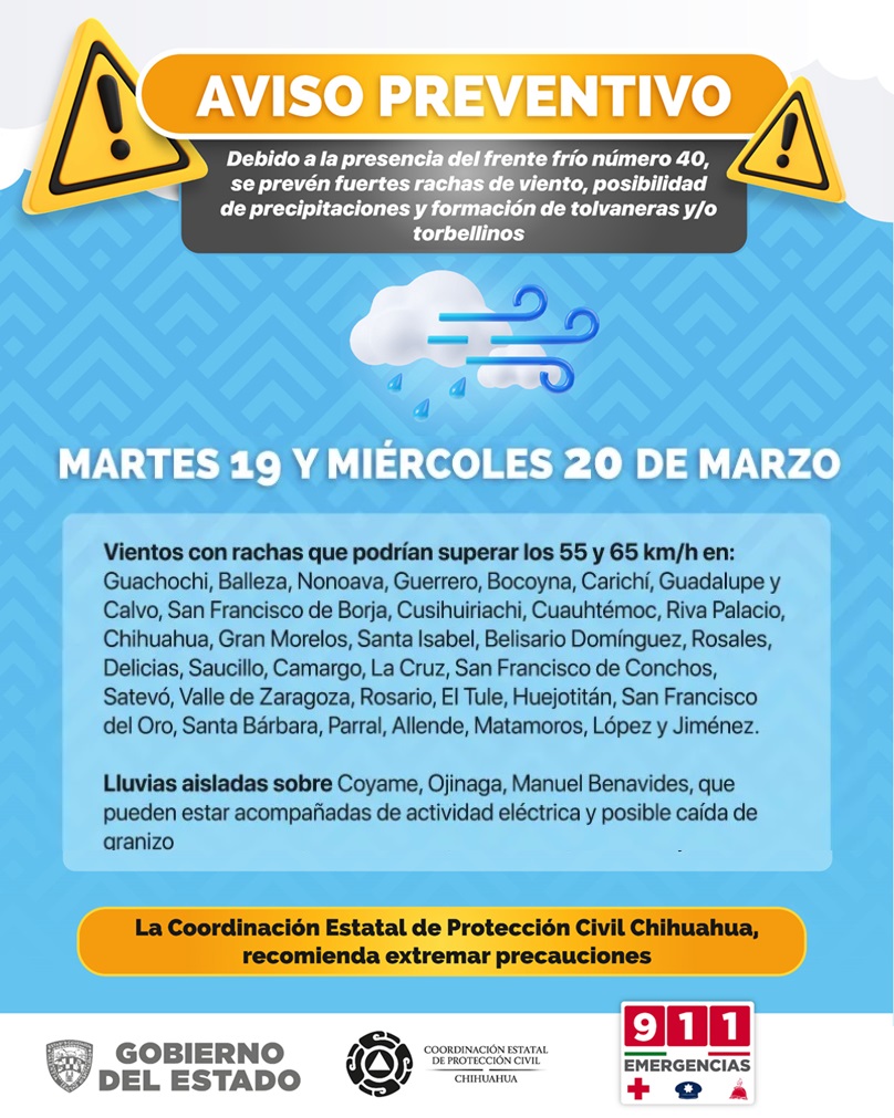 Las ráfagas de viento podrían alcanzar los 55 y 65 km/h en Guachochi, Balleza, Nonoava, Guerrero, Bocoyna, Carichí, Guadalupe y Calvo, San Francisco de Borja, Cusihuiriachi, Cuauhtémoc, Riva Palacio, Chihuahua, Gran Morelos, Santa Isabel y Belisario Domínguez.