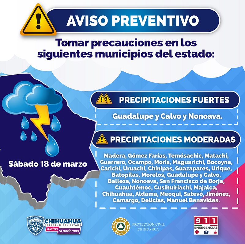 Con base en la información emitida por el Servicio Meteorológico Nacional y la Junta Central de Agua y Saneamiento (JCAS), la CEPC refiere que, para esta tarde de viernes hay potencial de vientos con rachas superiores a los 65 kilómetros por hora en los municipios de Balleza, Guachochi y Guadalupe Calvo.