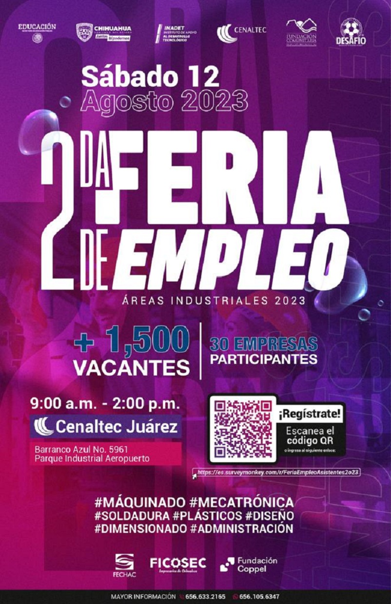 Chihuahua, Chihuahua – El Gobierno del Estado, a través de Centro de Entrenamiento en Alta Tecnología (CENALTEC) y en conjunto con la Fundación Comunitaria de la Frontera Norte (FCFN), realizará la segunda edición de la Feria de Empleo en Áreas Industriales.