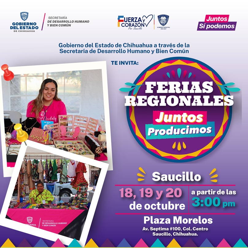 Chihuahua, Chihuahua – Cerca de 100 expositores de la región centro-sur, ofertarán sus productos y servicios durante la feria regional “Juntos Producimos”, que se llevará a cabo en Saucillo del 18 al 20 de octubre.