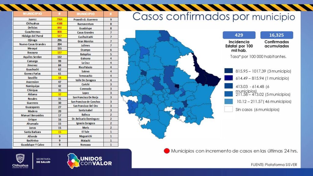 Los municipios con más contagios acumulados, son: Juárez 7,964, Chihuahua 4,388, Delicias 840, Cuauhtémoc 808, Hidalgo del Parral 547, Ojinaga 296, Nuevo Casas Grandes (NCG) 204, Meoqui 155, Bocoyna 137, Aquiles Serdán 132, Camargo 99, Jiménez 84, Guachochi 62, Gómez Farías 61, Saucillo 58, Ascensión 47, Namiquipa 42, Chínipas 35, Aldama 32, Rosales 31, Guerrero 30 y Guazapares 27.