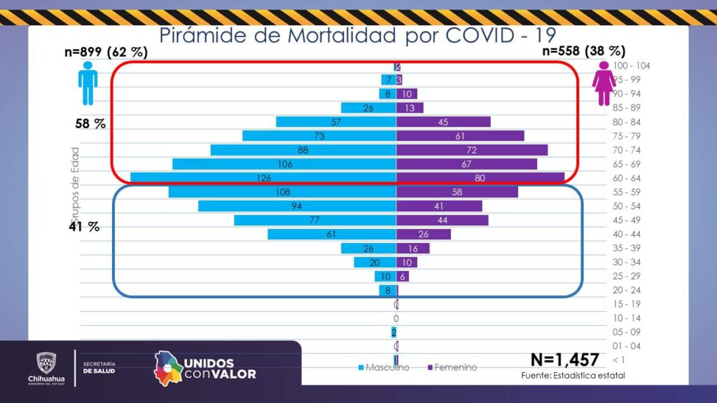 Chihuahua, Chihuahua – La Secretaría de Salud informó que la semana epidemiológica 39 inicia con un total de 16 mil 325 casos de COVID-19 en el estado de Chihuahua, con 105 nuevos confirmados, así como mil 457 personas fallecidas.