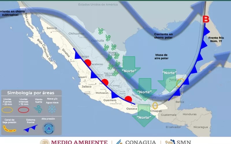 Estas condiciones son ocasionadas por el paso del frente frío número 17 y la masa de aire polar que tiene asociada, que favorece un ambiente de frío a muy frío por la mañana, templado por la tarde y temperaturas de muy frías a gélidas en la región serrana.