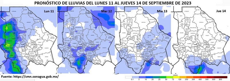 En partes de las zonas noroeste, oeste y suroeste, las lluvias serán de dispersas a moderadas, con chubascos de 5.1 a 25 mm en Janos, Nuevo Casas Grandes, Galeana, Ignacio Zaragoza, Buenaventura, Gómez Farías, Namiquipa, Bachíniva, Bocoyna, Chínipas, Batopilas, Guachochi y Cuauhtémoc.
