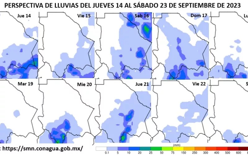 La dependencia estatal informó, además, que se prevén lluvias de dispersas a moderadas con chubascos (de 5.1 a 25 mm), en las zonas suroeste, sur y sureste. En el suroeste, sur y sureste, las precipitaciones serán de aisladas a dispersas (de 2.1 a 5 mm).