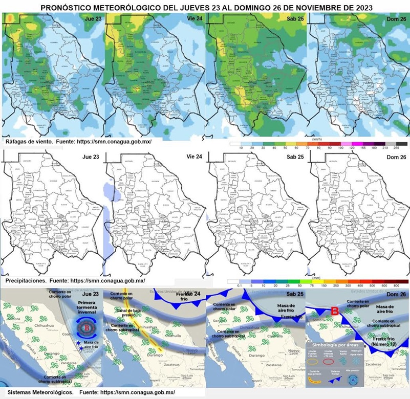 Los vientos pueden variar de los 5 a los 20 kilómetros por hora (km/h), con ráfagas que pueden alcanzar los 55 km/h en Palomas y Janos, y de hasta 45 km/h en Ascensión, Casas Grandes, Nuevo Casas Grandes, Madera y Satevó.