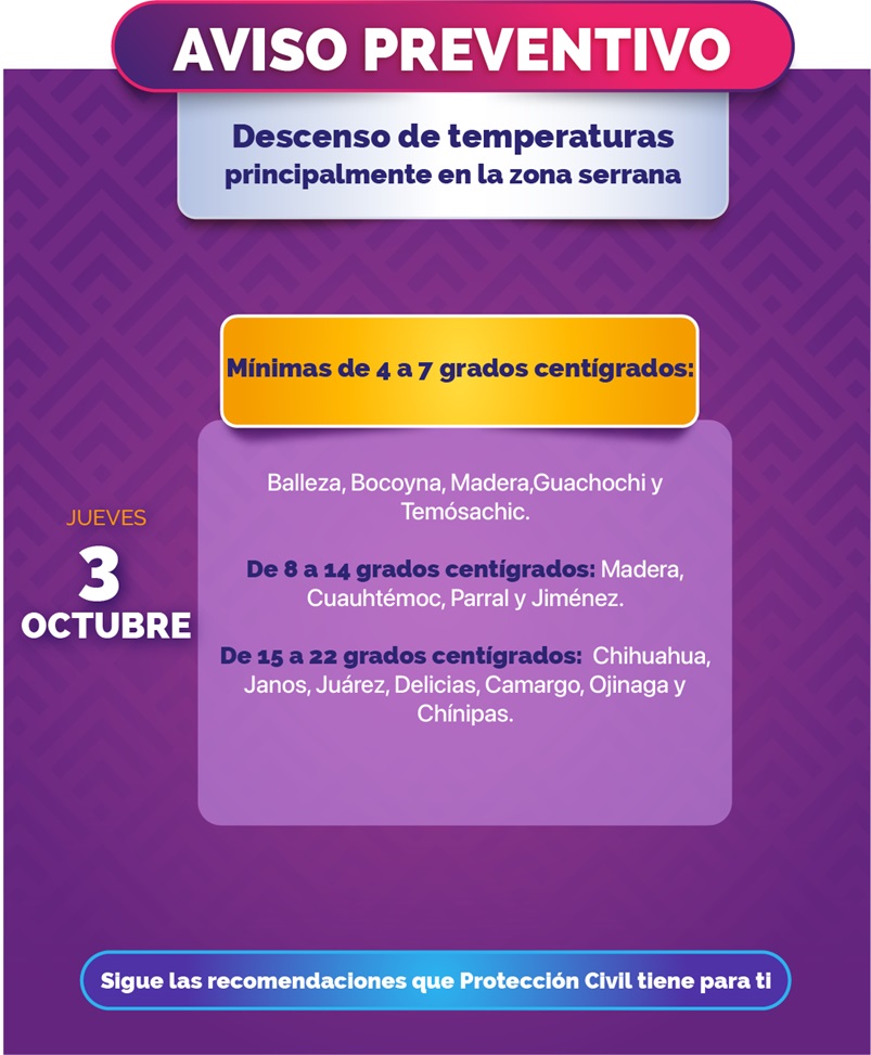 – Para el jueves 3 de octubre las temperaturas serán (máx/min °C): Chihuahua 31/16, Juárez 33/18, Janos 33/12, Madera 27/8, Temósachic 29/7, Cuauhtémoc 26/10, Ojinaga 31/16, Delicias 31/16, Camargo 30/16, Jiménez 29/14, Parral 28/13, Creel 25/5, Chínipas 39/22, Guachochi 23/6 y El Vergel 22/4.
