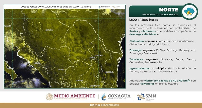 Asimismo, se prevén lluvias aisladas a dispersas para Juárez, Chihuahua, San Francisco de Borja, Satevó, Parral, Santa Bárbara, Saucillo, Allende, Jiménez, Camargo, Julimes, Aldama, Coyame y Ojinaga.