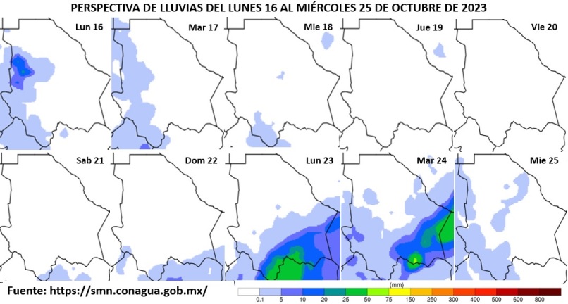 Asimismo, podrían presentarse lluvias aisladas, de 0.1 a 2 mm, en partes de las zonas noroeste, oeste, suroeste y centro como Janos, Casas Grandes, Galeana, Buenaventura, Bachíniva, Guerrero, Bocoyna, Maguarichi, Urique, Batopilas, Guadalupe y Calvo, Guachochi, Cuauhtémoc y Majalca.