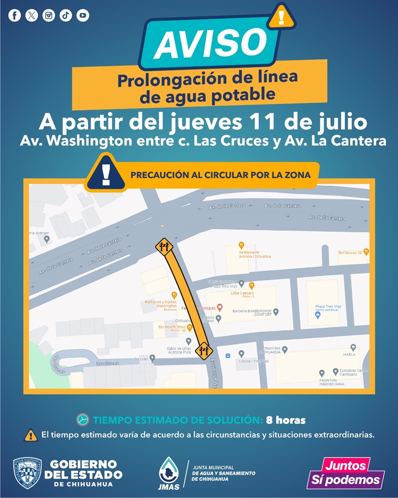 Chihuahua, Chihuahua – La Junta Municipal de Agua y Saneamiento (JMAS) de Chihuahua, informó que este jueves 11 de julio realizará trabajos de prolongación de línea de agua potable en la avenida Washington, entre la calle Las Cruces y la avenida La Cantera.